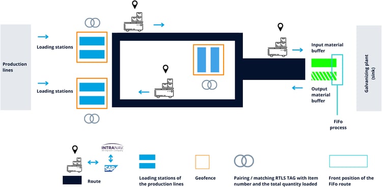 Implementation of the FIFO process in the galvanizing plant’s material buffer using timestamps. INTRANAV.IO recognizes the different loading points of individual production plants, buffer locations, & their loading situation.