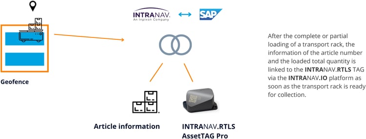 When a transport rack is loaded and ready for pickup, the article number and total loaded quantity is linked to the INTRANAV.RTLS TAG via the INTRANAV.IO platform. In the case of fully automated production plants, the trigger for updating the information (after completion of the loading process) comes from the plant control system itself. For semi-automated production plants, the trigger is initiated by an employee using an Android, iOS, or Windows device. INTRANAV.IO accesses this data (article number/number of pieces) via an interface and links it to the TAG (the TAG ID) as described above.