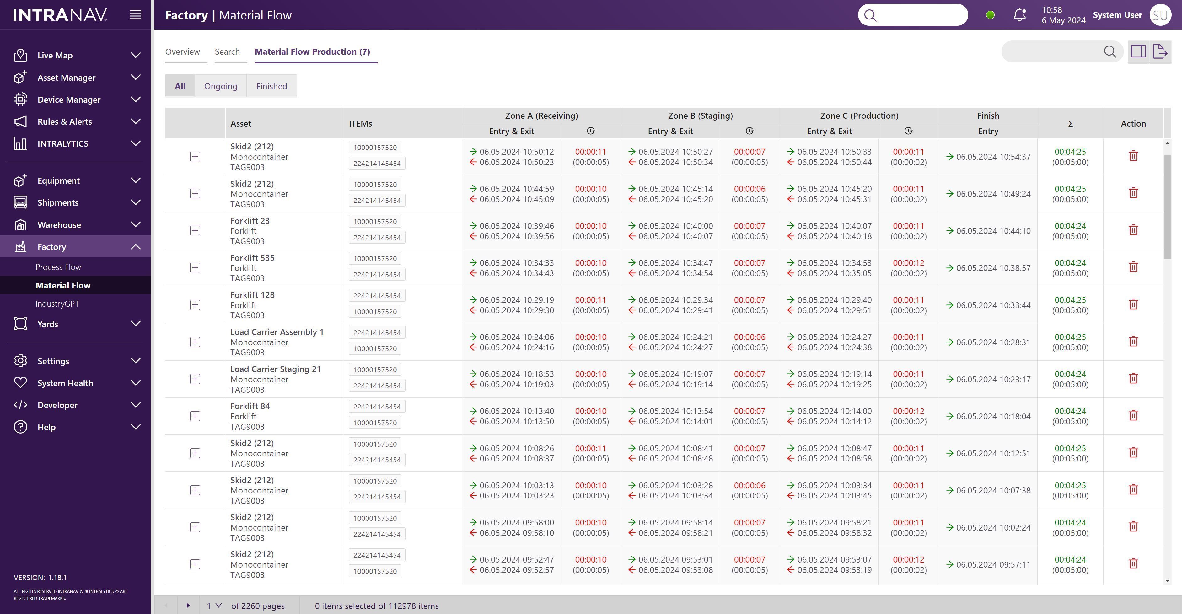 Real-Time Movement Capture: Track material entry and exit points across the shopfloor with second-level accuracy. This automates the recording of transport flows and material locations, replacing manual tracking with live data.