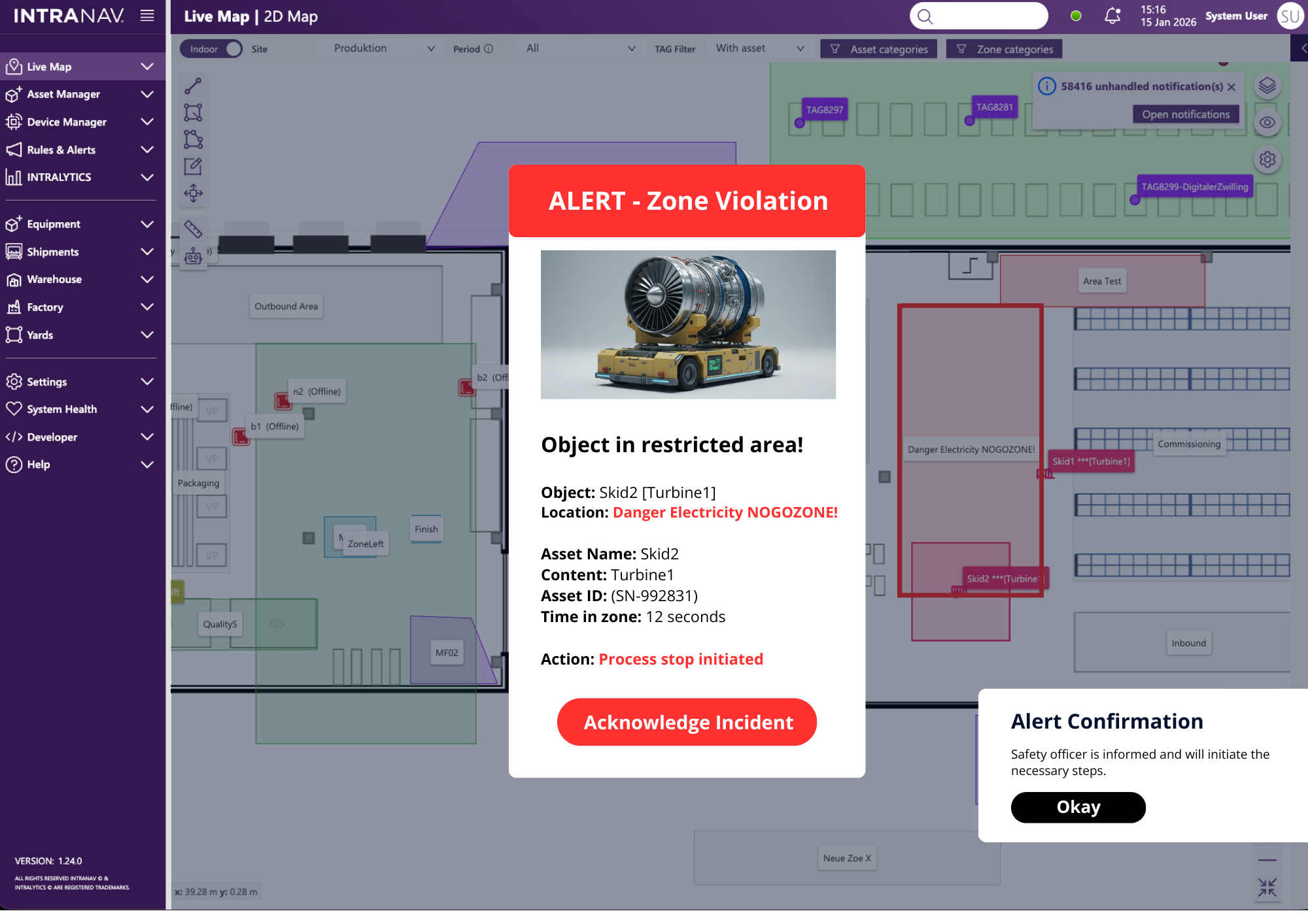 Proactive Zone-Based Alerts: Trigger automated notifications for unauthorized movements or process deviations based on specific geozones. These triggers integrate with third-party systems to handle errors instantly and maintain strict process compliance.